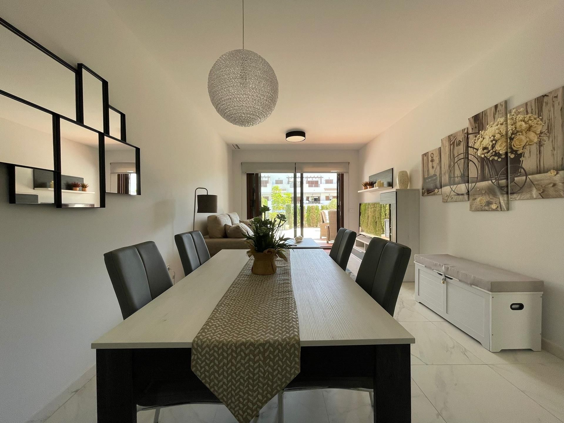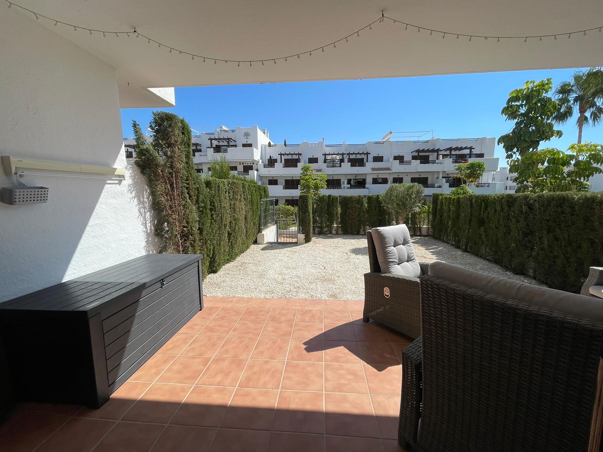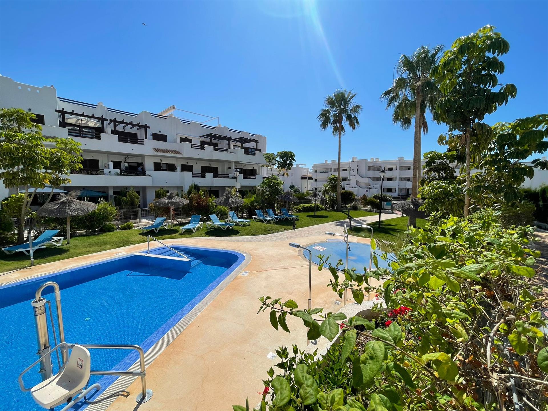Bel appartement luxueux avec piscine commune à San Juan de los Terreros, Andalousie, Espagne, pour 4 personnes. L'appartement est situé dans un complexe résidentiel et dans une zone balnéaire. L'appartement dispose de 2 chambres et 1 salle de bain. Le logement offre de l'intimité, un jardin avec gravier et arbres, un jardin commun gazonné, et une vue sur d'autres bâtiments.